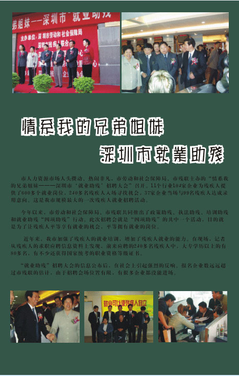 【概要描述】市人力資源市場(chǎng)人頭攢動(dòng)、熱鬧非凡,市勞動(dòng)和社會(huì)保障局、市殘聯(lián)主辦的“情系我的兄弟姐妹———深圳市‘就業(yè)助殘’招聘大會(huì)”召開(kāi)。11個(gè)行業(yè)104家企業(yè)為殘疾人提供了600多個(gè)就業(yè)崗位,240多名殘疾人入場(chǎng)尋找機(jī)會(huì),37家企業(yè)當(dāng)場(chǎng)與99名殘疾人達(dá)成錄用意向。這是我市規(guī)模最大的一次殘疾人就業(yè)招聘活動(dòng)。